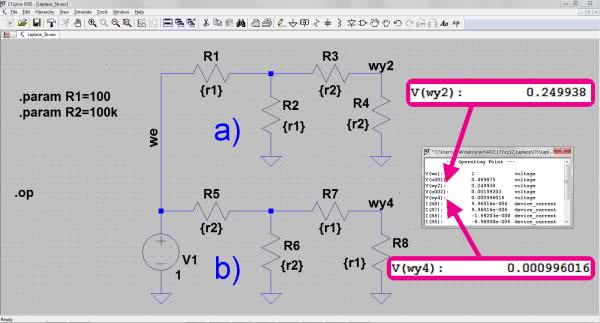 Przy połączeniu kaskadowym czwórników transmitancja powinna być równa H(s)=0,5*0,5=0,25. Sprawdźmy to dołączając czwórnik z rezystorami r2=100 kΩ do czwórnika z rezystorami r1=100 Ω (rysunek 14a), a następnie zamieniając kolejność czwórników (rysunek 14b).