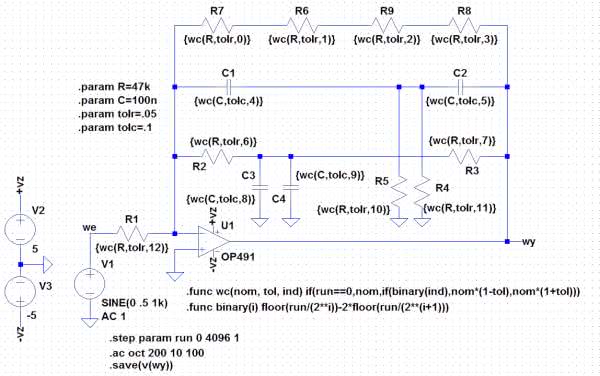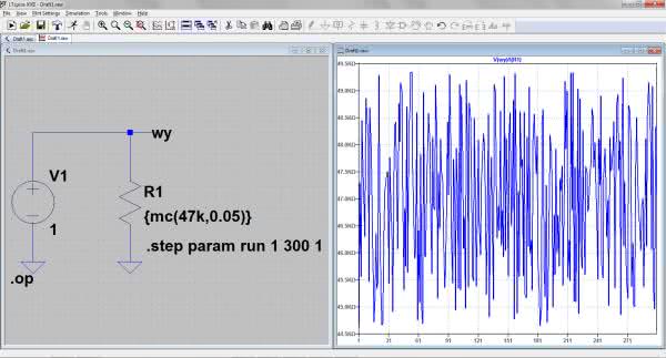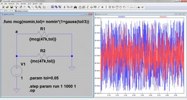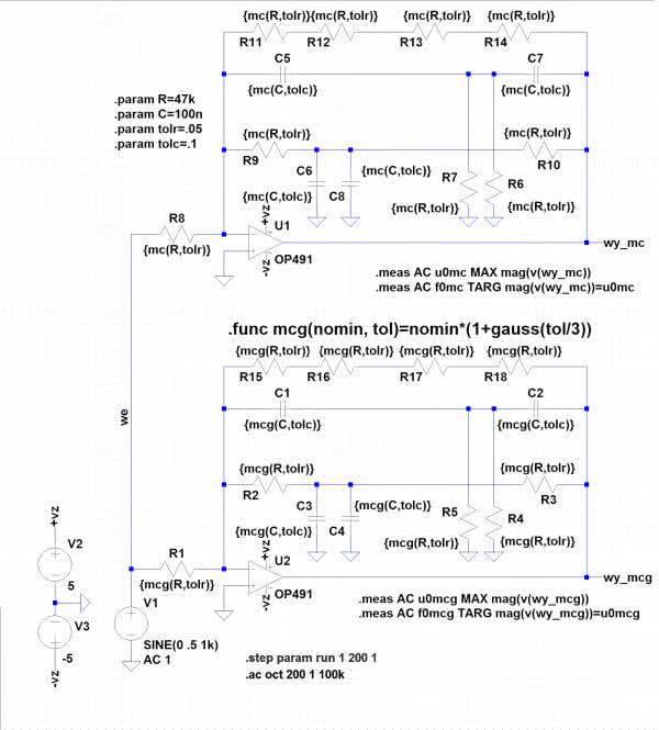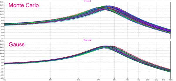 Autorzy programu LTspice zaimplementowali w nim funkcję mc(wartość nominalna, tolerancja), która miała stanowić narzędzie pozwalające uzyskiwać wyniki symulacji uwzględniające rozrzut wartości elementów wynikający z ich tolerancji. Praktycy wiedzą doskonale, że gdy zbudują na przykład dwa wzmacniacze, używając elementów o takich samych wartościach nominalnych, to w zasadzie jest pewne, że nie uzyskają identycznych parametrów, takich jak wzmocnienie, pasmo itp. Powodem jest naturalny rozrzut parametrów każdego fizycznego elementu zastosowanego w układzie.