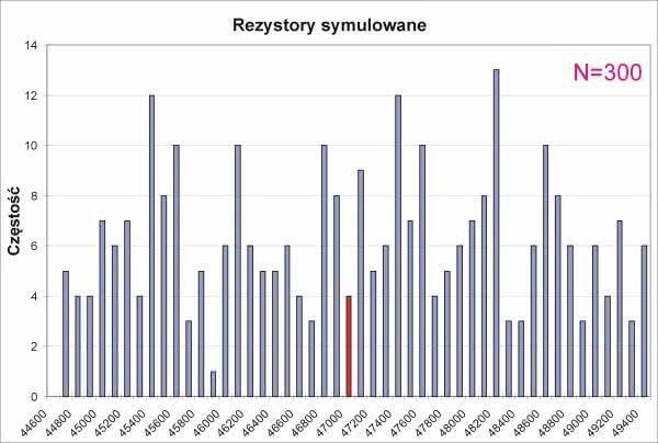 Ponieważ mają one mało czytelny zapis naukowy, można go zmienić na ogólny. Można również usunąć pierwszy wiersz zawierający nagłówki kolumn. Nie będą nam potrzebne. W polu D1 wpisujemy polecenie =min(b1:b300), które pokaże nam minimalną zmierzoną rezystancję. Podobnie w polu D2 podglądamy rezystancję maksymalną (=max(b1:b300)). Możemy już przystąpić do analizy statystycznej. W tym celu sporządzimy histogram pokazujący rozrzut wartości. W kolumnie F umieszczamy zakres zbioru. Są to liczby zmieniające się od 44600 do 49400, co 100, a więc w przybliżeniu od rezystancji minimalnej do maksymalnej. Z menu „Narzędzia” wybieramy „Analiza danych Histogram”, podając zakres komórek od B1 do B300, które zawierają zmierzone w symulatorze rezystancje. Zaznaczamy również opcję „Wykres wyjściowy”. Arkusz znajdzie się w materiałach dodatkowych do artykułu w pliku rezystory_sym_pom.xls. Wyniki tej analizy pokazano na rysunku 2.