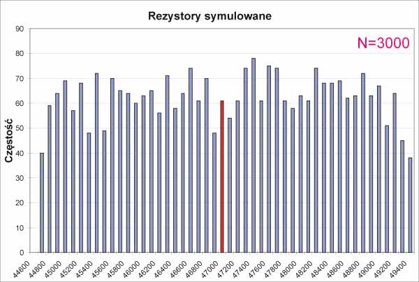 Przy zastosowanej liczbie pomiarów rozkład jest rozmyty, ale z pewną rezerwą można go nazwać równomiernym. Dla przypomnienia, dla rozkładu równomiernego częstości występowania poszczególnych wartości powinny być teoretycznie równe, a w praktyce zbliżone do siebie. Wyniki analizy dla 3000 rezystorów zaprezentowano na rysunku 3. Ten rozkład ma wygląd znacznie bardziej podobny do rozkładu równomiernego. Na obu wykresach zaznaczono czerwonym słupkiem wartość nominalną.