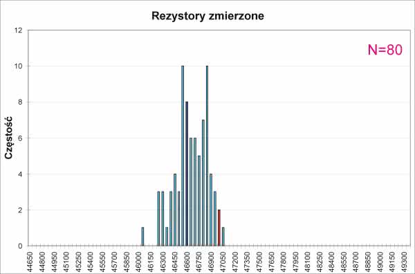 Wyciągnąłem z koszyka 80 sztuk 5-procentowych rezystorów 47 kV (tyle miałem pod ręką) i zmierzyłem ich rezystancje miernikiem Tektronix DMM914 o deklarowanej przez producenta dokładności ±(0,8%+10). Dalsze czynności były podobne do tych z symulacji, z tym że dane były już prawdziwe, ale niestety było ich znacznie mniej. Wyniki rozkładu rzeczywistych rezystancji pokazano na rysunku 5.
