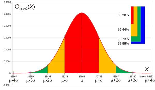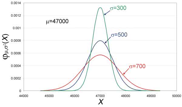 Na rysunku 6 pokazano 3 krzywe reprezentujące gęstość prawdopodobieństwa dla 3 zmiennych losowych o tej samej wartości średniej (47000) i odchyleniach standardowych równych: 300, 500 i 700. Geometryczną interpretacją odchylenia standardowego jest punkt przegięcia krzywizny krzywej Gaussa. Jakie ma to znaczenie praktyczne?