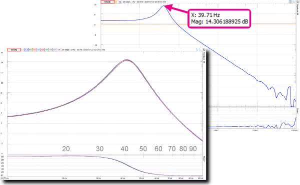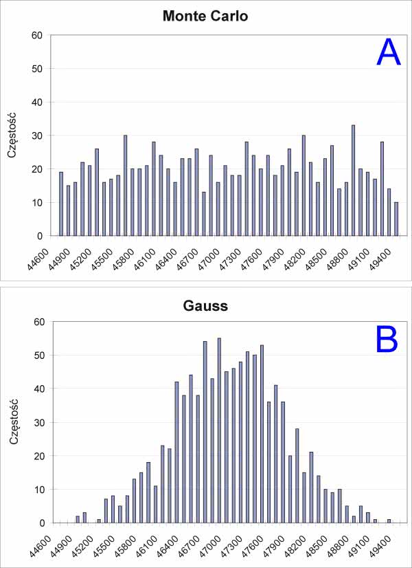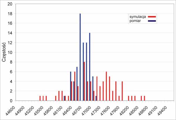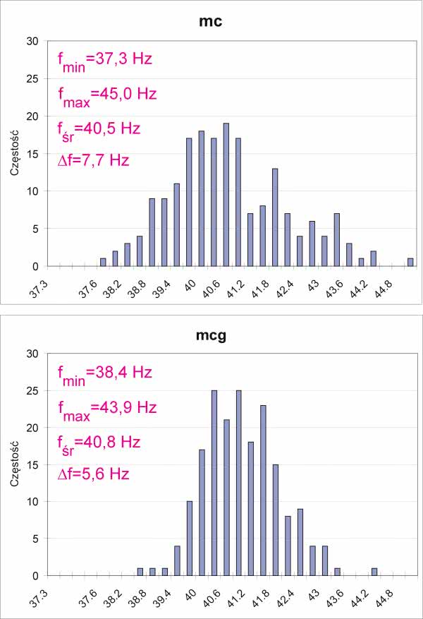 Średnia częstotliwość f0 dla metody Monte Carlo (mieszcząca się pomiędzy wartościami skrajnymi) jest równa 41,21 Hz, a pomiar z użyciem funkcji gauss dał wynik 41,26 Hz. Analogiczne rozrzuty tej częstotliwości są równe: 7,27 Hz i 4,71 Hz. Jak można się było spodziewać, uzyskiwane wartości w metodzie Monte Carlo są bardziej równomiernie rozrzucone w całym zakresie, w pomiarach z funkcją gauss są bardziej skupione wokół wartości średniej. Sprawdźmy teraz, jaka jest rzeczywistość.