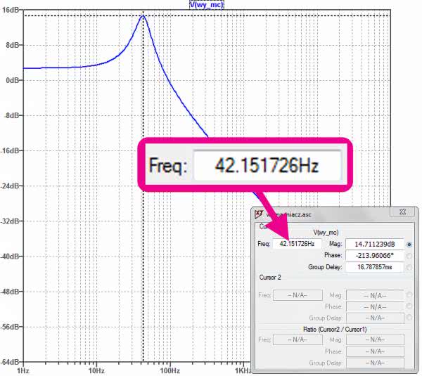 W drugiej linii symulator zapisuje w zmiennej f0mc aktualną częstotliwość pomiarową i czyni to aż do momentu, w którym napięcie wyjściowe będzie mniejsze od u0mc. Oznacza to, że w zmiennej f0mc została zapisana częstotliwość napięcia maksymalnego i dalsza modyfikacja tej zmiennej jest już zablokowana (opcja TARG). Analogicznie postępujemy dla wzmacniacza dolnego: