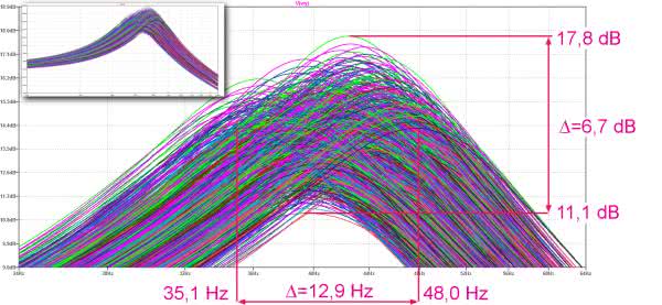 Rezystorów (i czasu) wystarczyło na zmierzenie 9 wzmacniaczy. To trochę mało ze statystycznego punktu widzenia. Czy mogą więc dziwić uzyskane wyniki (rysunek 15)? Okazało się, że rozrzut częstotliwości f0 zmieścił się w 2 krokach przemiatania częstotliwości w czasie pomiaru, a więc nie przekroczył 0,5 Hz (sic!). Różnice wzmocnienia dla częstotliwości f0 zmieściły się natomiast w 0,25 dB. W symulacji otrzymaliśmy ok. 7,27 Hz (4,71 Hz) i 2,81 dB (1,63 dB) dla metod odpowiednio mc i mcg.