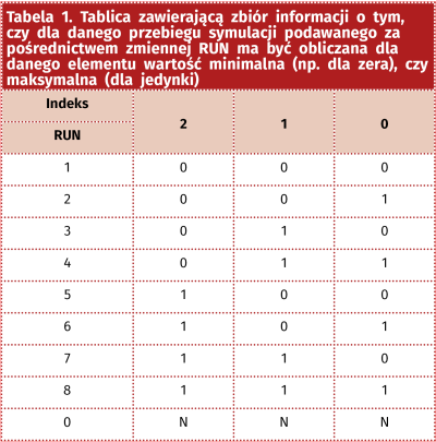 Algorytm można łatwiej zrozumieć, przyglądając się tabeli 1, sporządzonej dla 3 elementów. Przykładowo, dla przebiegu symulacji o numerze 6 element o indeksie 2 przyjmie wartość maksymalną (bo jest 1), element 1 przyjmie wartość minimalną (0), a element o indeksie 0 maksymalną (1). Funkcja binary ma zagnieżdżoną funkcję biblioteczną programu LTspice o nazwie floor(x). Oblicza ona liczbę całkowitą, która jest równa lub mniejsza od argumentu. Wygląda to dość zawile, ale po bliższej analizie zapisów funkcji wszystko powinno być jasne.