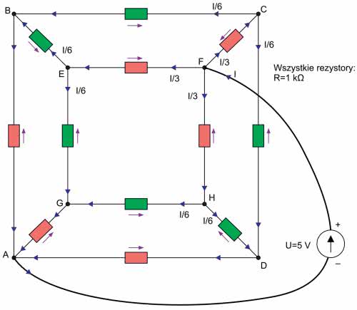 I tak – większy kwadrat ABCD niech będzie ścianką leżącą bliżej nas, ten mniejszy natomiast EFHG to ścianka leżąca w głębi. Zgodnie z założeniem zasilanie jest doprowadzone do węzłów A i F. Nasze zadanie jest ułatwione dzięki przyjętemu założeniu, że wszystkie rezystory kostki są jednakowe. Jeśli więc przyjrzymy się kostce w tej konfiguracji, to z pewnością dostrzeżemy, że układ połączeń jest symetryczny. W związku z tym w węźle F, do którego jest dołączony dodatni biegun zasilania, prąd rozpływa się na 3 jednakowe prądy stanowiące 1/3 prądu całkowitego (płynącego z zasilania). Rezystory, przez które przepływa prąd o tym natężeniu, wyróżniono na schemacie kolorem czerwonym. Analizując dalszą drogę przepływu tego prądu, dochodzimy do punktów E, C i H, w których prąd rozpływa się na kolejne dwa równe prądy o natężeniach: I/2·I/3=I/6. I znowu, w kolejnych węzłach B, D i G spotykają się dwa takie prądy dopływające do nich, wypływa natomiast jeden prąd stanowiący ich sumę, a więc I/3. Prądy o natężeniach I/3 sumują się w węźle A, z którego wypływają do źródła jako prąd o natężeniu I. Proste, prawda?