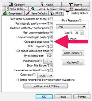 Wyjaśnienia wymagają ukośne połączenia na tym schemacie. Standardowo LTspice zakłada prowadzenie połączeń tylko w kierunkach prostopadłych do siebie, czyli pionowo i poziomo. Zasadę tę można lokalnie wyłączyć, naciskając przycisk Ctrl podczas prowadzenia połączenia. Połączenie jest wówczas prowadzone bez zachowania ortogonalności, jednak zawsze musi być ono zakończone w węźle siatki. Zasada ta zapewnia utrzymywanie ciągłości połączeń. Drugą metodą jest trwałe wyłączenie ortogonalności połączeń. W tym celu należy otworzyć okno parametrów domyślnych symulatora (ikonka z młotkiem), a następnie wybrać zakładkę „Drafting Options” i odhaczyć opcję „Orthogonal snap wires” (rysunek 5). Od tej chwili połączenia są prowadzone bez pilnowania ich otrogonalności, a naciśnięcie przycisku Ctrl przywraca chwilowo tę zasadę.
