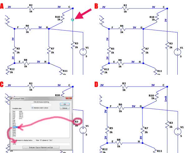 Przykładowo: chcemy umieścić na schemacie natężenie prądu płynącego w gałęzi z rezystorem R3. W tym celu wyświetlamy najpierw napięcie w jakimś punkcie tej gałęzi, klikając na niej lewym przyciskiem myszki (rysunek 6a). Na schemacie zostaje umieszczone napięcie we wskazanym punkcie (rysunek 6b). Następnie poddajemy wyświetloną wartość edycji, klikając na nią tym razem prawym przyciskiem, co powoduje wyświetlenie okna „Displayed Data” (rysunek 6c). Ponieważ chcemy wyświetlić prąd płynący przez rezystor R3, wyszukujemy w wyświetlonych danych prądu I(R3) i dwukrotnym kliknięciem wprowadzamy ten prąd do pola „Edit expression to display below”. Należy pamiętać o wcześniejszym usunięciu znaku dolara, który domyślnie jest tu wyświetlany. Na koniec naciskamy przycisk OK, co powoduje umieszczenie natężenia prądu na schemacie (rysunek 6d). Może się zdarzyć, że na schemacie nie ma już miejsca na umieszczenie kolejnej informacji. Dobrą rozwiązaniem jest odsunięcie informacji o prądzie w dogodne miejsce i wskazanie gałęzi, do której się ona odnosi, linią rysunkową („Edit → Draw → Line”) – rysunek 7.