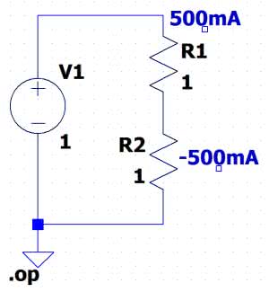 Do weryfikacji naszych wyników konieczne jest wykonanie symulacji .op (DC operating point). Kończy się ona wyświetleniem tabelki, w której zebrano wszystkie napięcia i prądy występujące w obwodzie. Taka analiza jest jednak dość niewygodna, znacznie lepiej jest nanieść te wartości bezpośrednio na schemacie. Do umieszczenia napięć węzłowych wystarczy po zakończeniu symulacji .op kliknąć na jakiś punkt leżący na połączeniu prowadzącym do danego węzła. Nieco więcej czynności wymaga umieszczenia prądu płynącego w danej gałęzi.