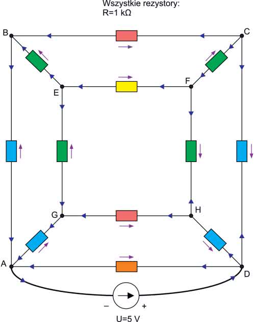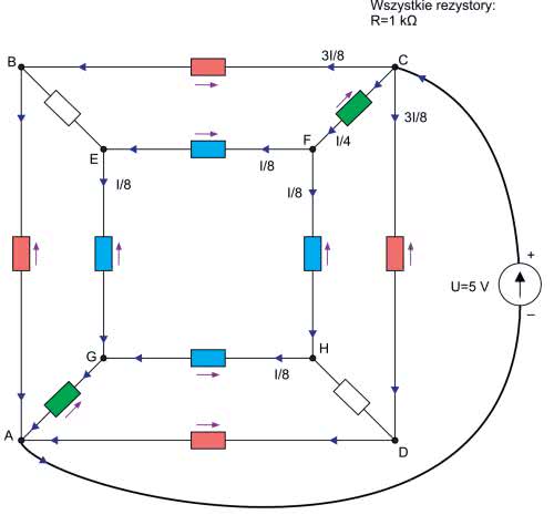 Zastosowana metoda pozwoliła obliczyć rezystancję widzianą w wybranych dwóch punktach, w tym przypadku od strony zasilania. Aby policzyć prądy i napięcia w innych punktach należałoby przeprowadzić podobny tok obliczeniowy, tak aby zakończyć rozważania na tych właśnie punktach. Okazuje się, że wówczas jest to jednak metoda dość uciążliwa. Popatrzmy jeszcze raz na rozrysowaną kostkę z rysunku 11. Prąd płynący z zasilania na drodze DHGA i na drodze DCBA wytwarza spadki napięć na takiej samej liczbie rezystorów, zatem prądy płynące w gałęziach DH i DC muszą być równe. Oznacza to, że prąd płynący ze źródła pomniejszony o prąd gałęzi DA dzieli się na dwie równe części. Obliczamy: