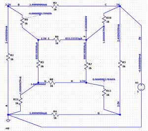 Uruchamiamy symulację poleceniem .op i natychmiast zostają wyświetlone wyniki. Szybka ich analiza potwierdza prawidłowość obliczeń. Jest tylko małe „ale”. W gałęziach, przez które miał nie płynąć prąd, symulator jednak coś wykrył. Obliczył, że popłynie prąd o natężeniu 0,000888 fA (femtoamperów), czyli 8,888·10-19. Jest to oczywiście błąd obliczeniowy wynikający z zaokrągleń, którym nie należy się przejmować.