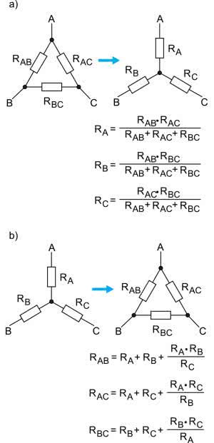 Oba przypadki pokazano na rysunku 12. Na rysunku 12a mamy połączenie w układzie trójkąta, które przekształcimy w gwiazdę. Przekształcony obwód jest pod względem elektrycznym dokładnym odpowiednikiem konfiguracji pierwotnej, tzn. w węzłach A, B i C obu obwodów występują takie same napięcia. Również prądy wpływające do nich są identyczne.