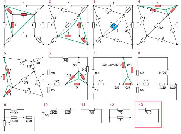 Naszą kostkę będziemy w kolejnych krokach zwijać, aż do uzyskania jednego rezystora, który pozwoli obliczyć prąd pobierany ze źródła i rezystancję kostki. Dla uproszczenia obliczeń zakładamy, że wszystkie rezystory mają rezystancję 1 Ω. Kolejne etapy zwijania przedstawiono na rysunku 13.