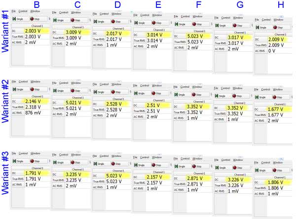 Do pomiarów w zasadzie wystarczyłby zwykły woltomierz, ponieważ jednak zawsze w części praktycznej używaliśmy zestawu Analog Discovery 2, również i teraz z niego skorzystamy. Pomiar wykonujemy za pomocą narzędzia Voltmeter, używając 1. kanału. Kostkę zasilamy zasilaczem zestawu, ustawiając w nim napięcie 5 V. Mierzymy tylko napięcia węzłowe, masa miernika i masa zasilacza są wewnętrznie połączone w przyrządzie. Do kostki wystarczy więc dopiąć się jednym kabelkiem masowym. Dla wygody końcówki kabelków mogą być dołączone do krokodylków, którymi łatwo będzie przepinać się między kolejnymi punktami pomiarowymi. Wyniki wszystkich pomiarów pokazano na rysunku 15.