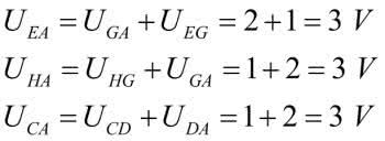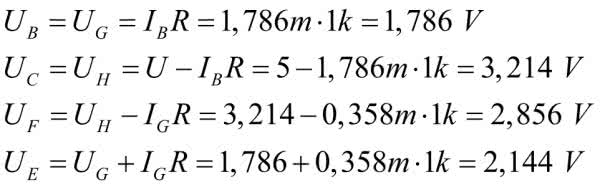 Inżynierska poprawność nakazuje jeszcze obliczenie napięć we wszystkich węzłach kostki mierzonych względem masy, czyli punktu A. Mamy już policzone napięcia: