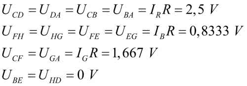 Takie napięcie będzie występowało na wszystkich czerwonych rezystorach. Biegunowość tych napięć zaznaczono na schemacie strzałkami. Trzymając się konwencji, że pierwszy indeks oznacza punkt o wyższym potencjale, możemy napisać:
