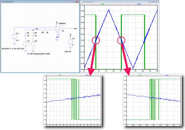 W eksperymencie zastosujemy komparator AD8561, którego model jest już na arkuszu schematu (w chwili pisania artykułu modelu tego nie było jeszcze w standardowej bibliotece), i dla którego został przygotowany symbol. Do wejścia nieodwracającego dołączamy źródło napięcia stałego 2,5 V pełniące funkcję napięcia referencyjnego. Do wejścia odwracającego są dołączone dwa źródła napięciowe: V3 – wytwarza napięcie piłokształtne o amplitudzie 5 V i czasie narastania i opadania równym 10 sekund (źródło to imituje jakieś wolnozmienne zjawisko), B1 – generuje pseudoprzypadkowy szum, który dodaje się do sygnału źródła V3. Zapewniają to rezystory R1, R2 i R3. Do generowania szumu zastosowano źródło „Arbitrary behavioral voltage source” z parametrem V=.40*random(time*100). Symulacja wykazała, że rzeczywiście dla napięcia wejściowego równego napięciu referencyjnemu 2,5 V następuje przerzut stanu wyjścia komparatora, ale już na pierwszy rzut oka widać, że z napięciem tym dzieje się coś dziwnego. Rozciągamy więc przebiegi w okolicach ich przecięcia przy 2,5 V i okazuje się, że faktycznie występują w tym punkcie przypadkowe przerzuty. Jest tak zarówno dla sygnału opadającego jak i narastającego. Jesteśmy w kropce. Żarówka nie pożyje długo, jeśli będzie tak eksploatowana.