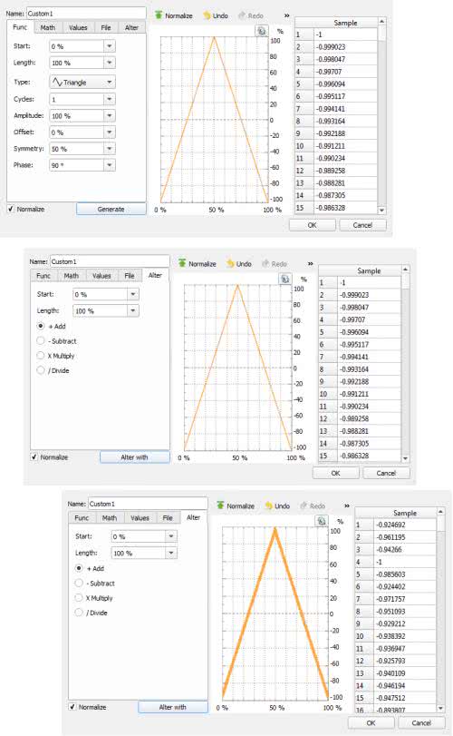 Dla upewnienia się budujemy szybko układ rzeczywisty wg schematu podobnego do tego, którego użyliśmy w symulacji. Źródłem referencyjnym jest 2. kanał generatora arbitralnego Analog Discovery 2, natomiast sygnał wejściowy tworzymy jako przebieg użytkownika w 1. kanale generatora. Najpierw przygotowujemy przebieg trójkątny używając opcji „Func” z parametrami: Start=0%, Lenght=100%, Type=Triangle, Cycles=1, Amplitude=100%, Offset=0%, Symmetry=50%, Phase=90°, opcja „Normalize” zaznaczona (rysunek 11). Następnie nakładamy na ten przebieg szum zaznaczając zakładkę „Alter” i wybierając opcję „+Add”. Klikamy na przycisk ekranowy Alter with i wybieramy zakładkę „Math”. W polu edycyjnym umieszczamy formułę: 0.1*random() i klikamy na przycisk Generate, a następnie OK. Ponownie jesteśmy przerzuceni do okna z przebiegiem piłokształtnym, tylko teraz już widzimy, że jest on zaszumiony. Jeszcze raz klikamy na przycisk OK, co kończy pracę nad edycją tego przebiegu.
