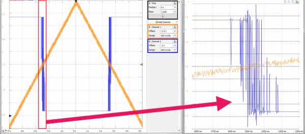 Do pomiaru ustawiamy amplitudę 2,5 V, offset też 2,5 V i częstotliwość 100 mHz. Przebieg na oscyloskopie oglądamy w trybie „Screen” z podstawą czasu 1 s/dz. Wyraźnie widzimy niepożądane przerzuty, takie same, jakie obserwowaliśmy w symulacji. Do dokładniejszej obserwacji można uruchomić okno „Zoom” (rysunek 12).