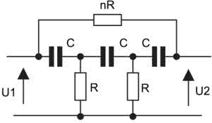 Na rysunku 1 została pokazana jedna z wersji przesuwnika fazowego, który zastosowany jako filtr pasmowozaporowy spełnia bardzo dobrze to zadanie. Jego własności zależą od współczynnika n – przy n=12 i częstotliwości rezonansowej f0, napięcie wyjściowe czwórnika jest równe zeru i może być zastosowany jako filtr. Z kolei, gdy n=54, przy niewielkich zmianach rezystancji nR (np. ±10%) częstotliwość zmienia się niemal bez wpływu na tłumienie, czyli na składową czynną filtrowanego napięcia. Jednak w tych warunkach, gdy składowa bierna (zależna od częstotliwości) jest równa zeru, napięcie wyjściowe U2 wynosi –U1/26. Takie napięcie trzeba skompensować, aby uzyskać zero napięcia wyjściowego. Podobnie przy n=20, U2=–U1 /40 (około), ale po wstawieniu do układu dodatkowego rezystora o rezystancji R/10, łączącego rezystory czwórnika z węzłem wspólnym dla wejścia i wyjścia, własności czwórnika zostają istotnie zmienione.