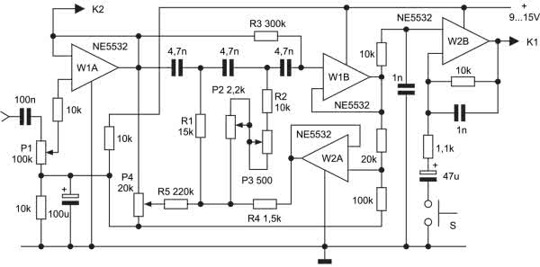 Taki zmodyfikowany przesuwnik fazowy został zastosowany w filtrze pokazanym na rysunku 2. Dodatkowy rezystor R4 sprawia, że napięcie wyjściowe o częstotliwości rezonansowej f0 staje się bliskie zeru i może być całkowicie wytłumione po regulacji potencjometrem P4. Ponadto, w ten sposób zmiana rezystancji rezystora R2 potencjometrem P2, a także dokładna, potencjometrem P3, przestraja filtr w granicach ok. ±2,2% przy średniej częstotliwości ok. 1050 Hz niemal bez wpływu na tłumienie. Taki zakres przestrajania wystarcza, aby zrównywać częstotliwości filtra i generatora.