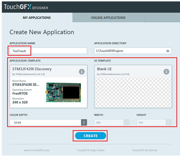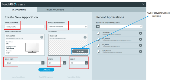 Po uruchomieniu TouchGFX Designer rozpoczynamy nowy projekt. W oknie Application Name nadajemy mu nazwę na przykład TestSymulatPC. Ścieżka dostępu do folderów z pikami projektów jest określana w oknie Application Directory. Foldery mają taką samą nazwę jak projekty. Kreator nowej aplikacji umożliwia na tym etapie określenie bitowej głębi kolorów i rozmiaru wyświetlacza (rysunek 1).