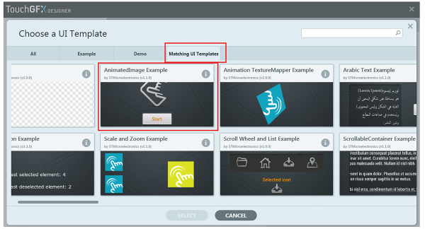Z listy u góry wybieramy opcję MatchnigUITemplate, po to by na liście były tylko szablony pasujące do ustawień projektu (rozdzielczości wyświetlacza). Wybieramy pierwszy z listy AnimatedImage Example i klikamy na Select. Teraz wybrany szablon pojawi się w okienku Template okna Create New Application (rysunek 3).