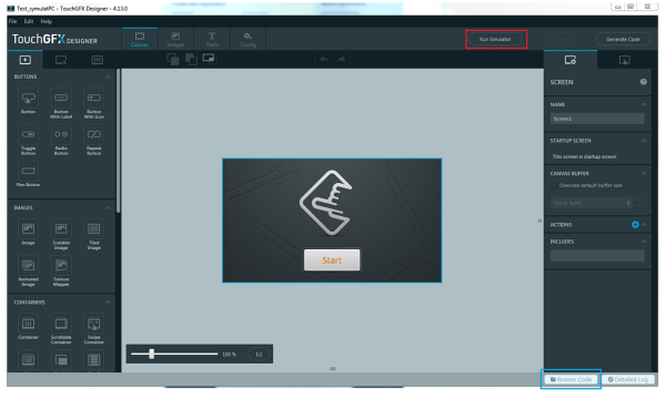Po kliknięciu na przycisk Start jest wyświetlana animacja ruchu ikony umieszczonej nad przyciskiem Start. Po kliknięciu na przycisk Browse Code otwiera się katalog z plikami projektu wygenerowanymi przez TouchGFX.