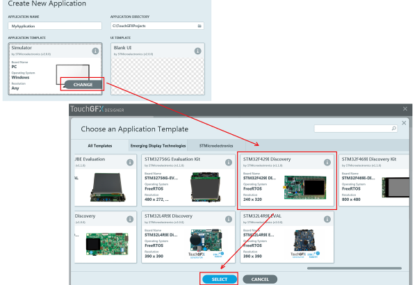 Kreator nowego projektu automatycznie ustawia domyślnie w oknie APPLICATION TEMPLATE opcję symulatora PC, a w oknie UI TEMPLATE BLANK UI. W poprzednim przykładzie zmieniliśmy UI TEMPLATE na AnimatedImage Example tak jak to zostało pokazane na rysunku 2. Żeby możliwe było wygenerowanie szablonu projektu współpracującego z jednym z modułów ewaluacyjnych trzeba go wybrać w oknie APLICATION TEMPLATE (rysunek 6). Klikamy na przycisk CHANGE w oknie APPLICATION TEMPLATE i z listy Choose an Application