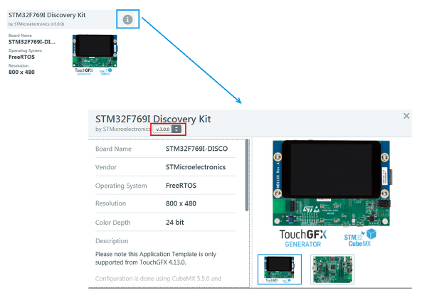 Niestety w trakcie pisania tego artykułu była dostępna wersja TouchGFX 4.13, w której generowanie szablonów nie działało dla wszystkich modułów z listy. Na stronie http://bit.ly/3rGaeXr jest umieszczona informacja, że poprawnie działają szablony w wersji V3.0 i wyższej. Program jest ciągle rozwijany i kolejne moduły są prawidłowo wspierane. Dostępne wersję szablonu można wybrać klikając na ikonkę i wybieranego modułu (rysunek 7).