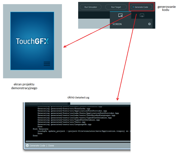 Po kliknięciu na przycisk CREATE TouchGFX komunikuje się z serwerami ST i generuje projekt widoczny na ekranie Designer’a. W tym momencie powinniśmy móc skompilować wygenerowany kod i po kompilacji przesłać go do pamięci mikrokontrolera. Projekt jest kompilowany po kliknięciu na przycisk Generate Code. Przebieg kompilacji możemy obserwować a oknie otwieranym po kliknięciu na Detailed Log (rysunek 9).