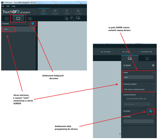 Każdy ekran jest identyfikowany przez swoją nazwę. Kreator pustego szablonu generuje jeden ekran startowy o domyślnej nazwie Screen1. Ponieważ jest to ekran, który będzie wyświetlany po uruchomieniu aplikacji (startup screen) to zmienimy jego nazwę na main. Na rysunku 12 zostało pokazane zarządzanie ekranami. Okno Screens z lewej strony ekranu głównego wyświetla wszystkie ekrany projektu (w tym momencie tylko jeden główny main). Ikona + (plus) umożliwia dodawanie do listy kolejnych ekranów według potrzeb. Okno SCREEN z prawej strony ekranu głównego TouchGFX Designer umożliwia zmianę nazwy okna (pole NAME). Na dole okna SCREEN umieszczono pole ACTIONS w którym dodaje się akcje powiązane z ekranem.