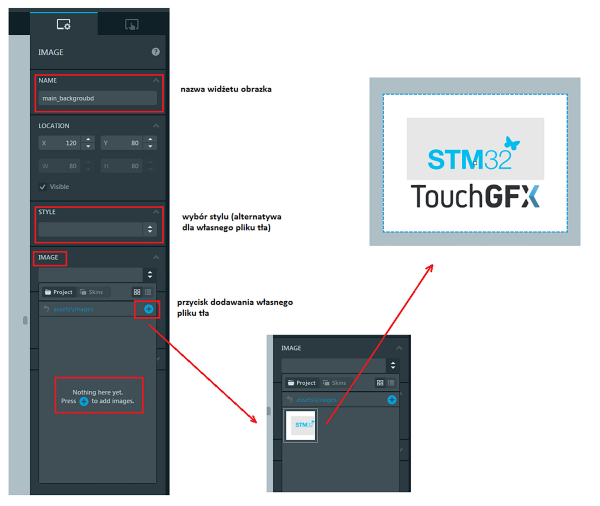 Kolejnym krokiem będzie dodanie tła ekranu. Możemy użyć do tego celu obrazka o rozmiarze w pikselach nie większym niż rozdzielczość ekranu LCD, który jest zapisany w formacie .png (tylko taki format jest akceptowany przez TouchGFX Designer). Istnieje też możliwość wyboru jednolitego tła (stylu), czyli przygotowanego pliku .dng jednolicie białego Obrazek o żądanej rozdzielczości przygotowujemy sobie wcześniej i zapisujemy w folderze na dysku. Z otwartego okna Sreens przechodzimy do okna dodawania widżetów z lewej strony ekranu głównego i z listy Images wybieramy Image. W oknie ekranu pojawi się ikona, którą możemy przesuwać po ekranie (rysunek 13). Dodaliśmy widżet obrazka i w kolejnym kroku trzeba określić co to za obrazek, czyli wybrać jego lokalizację na dysku. Klikamy na ikonę obrazka i z prawej strony okna Deignera pojawia się okno właściwości IMAGE.