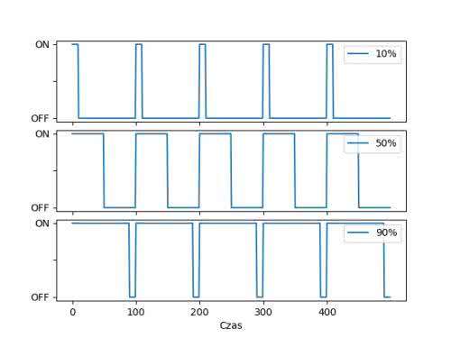 Sterowanie diod elektroluminescencyjnych za pomocą impulsów o zmiennym wypełnieniu jest bardzo praktycznym rozwiązaniem. Do sterowania diodą LED w ten sposób wystarczy pojedyncze wyjście cyfrowe, które może generować przebieg prostokątny. Modulacja PWM polega na zmianie wypełnienia przebiegu prostokątnego, który podawany jest na wyjście cyfrowe układu. W dużym uproszczeniu tego rodzaju sterowanie polega na naprzemiennym włączaniu i wyłączaniu zasilania diody. Stosunek czasu, gdy zasilanie jest załączone i jest podawane na wyjściu, do ogólnego czasu trwania jednego okresu nazywa się właśnie wypełnieniem sygnału. Wartość ta podawana jest w procentach. Dla wypełnienia 50% zasilanie będzie podawane na diodę LED przez połowę czasu trwania okresu. Na rysunku 3 zaprezentowano trzy przebiegi tego rodzaju, różniące się wypełnieniem (pokazano przebiegi o wypełnieniu (od góry): 10%, 50% oraz 90%).