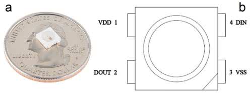 Jednymi z najpopularniejszych diod RGB ze zintegrowanym sterownikiem są układy WS28xx. Przykładowa dioda tego rodzaju pokazana jest na rysunku 5a. Są one dostępne w szerokiej gamie elementów, różniących się liczbą diod w strukturze – niektóre z nich zawierają trzy diody – czerwoną, zieloną i niebieską, a inne dodatkowo uzupełnione są diodą białą, tworząc tzw. diodę RGBW. Symbol elektryczny takiej diody pokazano na rysunku 5b. Ma ona cztery piny, dwa z nich (VCC i GND) służą do zasilania, a dwa pozostałe (DIN oraz DOUT) do komunikacji.