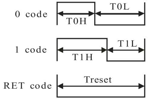 Protokół komunikacji z modułami tego rodzaju bazuje na kodowaniu NRZ, czyli bez powrotu do zera. Jest to rodzaj kodowania, który zera i jedynki pozwala zapisać jako przejścia pomiędzy dwoma stanami (napięciami), a to, czy dane zbocze jest zerem, czy jedynką (czy resetem), uwarunkowane jest zależnościami czasowymi. Na rysunku 6 zaprezentowano takie przejścia dla układu WS2812B.