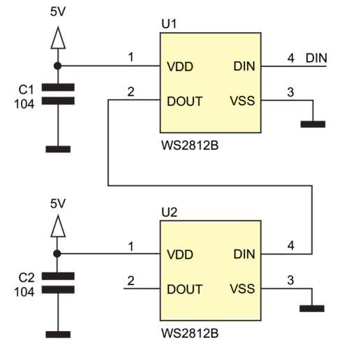 Moduł WS2812B ma wewnętrzny, 24-bitowy zatrzask, który zatrzaskuje dane wejściowe, w momencie gdy na wejście DIN podany zostanie komplet bitów po resecie. Kolejne bity podawane na wejście podawane są do układu, który wzmacnia je, regeneruje zbocza etc. i podaje na wyjście – DOUT. Dzięki temu można łączyć kaskadowo ze sobą diody RGB tego rodzaju w szereg, podłączając wyjście DOUT jednej diody do wejścia DIN kolejnej diody. Na rysunku 7 zaprezentowano schemat kaskadowego układu tego typu.