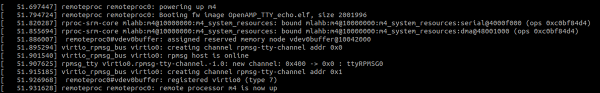 Po uruchomieniu przykładu, w terminalu zobaczymy kilka komunikatów świadczących o włączeniu rdzenia Cortex-M4 i utworzeniu dwóch kanałów komunikacji RPMSG (rysunek 2).