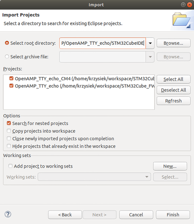 Po zainstalowaniu środowiska STM32CubeIDE importujemy projekt za pomocą opcji File → Import, a następnie wybierając w oknie dialogowym General → Existing Projects into Workspace. W kolejnym oknie musimy wskazać katalog z projektem (STM32Cube_FW_MP1_V1.3.0/Projects/STM32MP157C-DK2/Applications/OpenAMP/OpenAMP_TTY_echo/STM32CubeIDE) tak jak na rysunku 3, a następnie przyciskiem Finish kończymy cały proces.