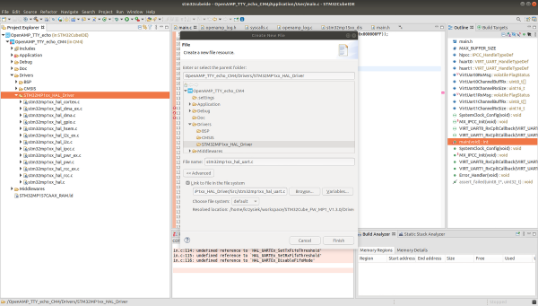 Do poprawnej kompilacji powinniśmy dodać do projektu nagłówki z definicjami i deklaracjami dla portu UART przez odkomentowanie linii #define HAL_UART_MODULE_ENABLED w pliku Inc/stm32mp1xx_hal_conf.h. Musimy także uwzględnić w projekcie niezbędne pliki sterowników z biblioteki STM32Cube – klikamy prawym przyciskiem myszy na katalog STM32MP1xx_HAL_Driver w drzewie projektu po lewej stronie i wybieramy opcję New → File. W oknie dialogowym, które się pojawiło wybieramy opcję Advanced i podajemy ścieżkę do pliku sterownika UART: ${PARENT-7-PROJECT_LOC}/Drivers/STM32MP1xx_HAL_Driver/Src/stm32mp1xx_hal_uart.c, tak jak na rysunku 4. W podobny sposób musimy dodać także plik ${PARENT-7-PROJECT_LOC}/Drivers/STM32MP1xx_HAL_Driver/Src/stm32mp1xx_hal_uart_ex.c.
