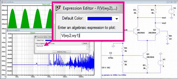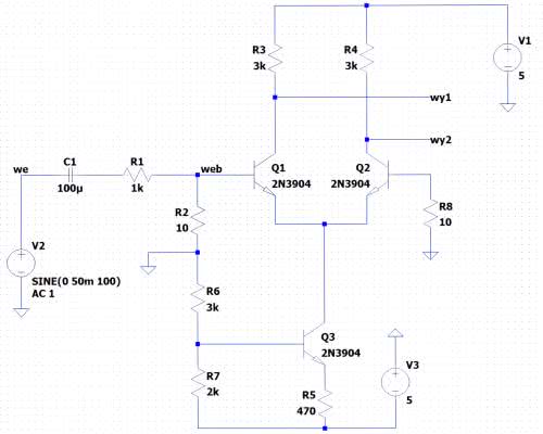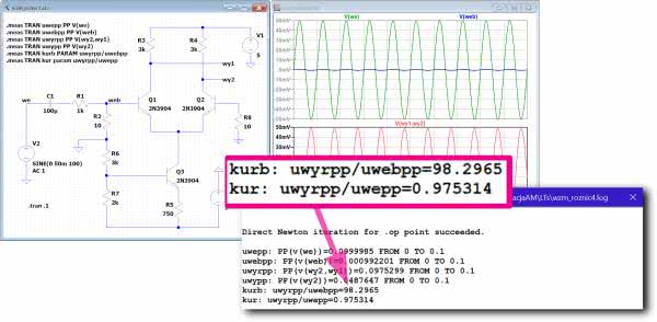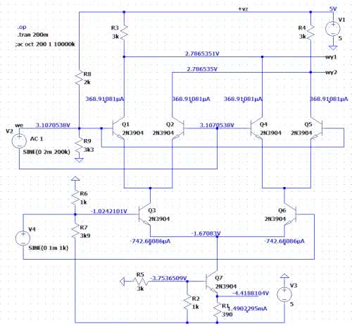 Układ wzmacniacza jest już kompletny, pozostaje tylko sprawdzić czy wzmocnienie jest zgodne z obliczeniami. W tym celu definiujemy polecenia obliczające napięcia peak-to-peak na wejściu (uwepp), na bazie tranzystora Q1 (uwebpp) i na wyjściu różnicowym pomiędzy kolektorami (uwyrpp)