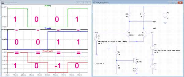 Rozpatrzmy układ z rysunku 1. Jest to typowy wzmacniacz różnicowy zbudowany na tranzystorach dyskretnych 2N3904. Nazwa „różnicowy” mogłaby sugerować, że wejście powinny tworzyć dwie linie, do których są podawane dwa sygnały, a na wyjściu pojawia się wzmocniona ich różnica. Rzeczywiście, w ogólnym przypadku tak jest, o czym świadczy przykład z rysunku 2. Mamy tu tranzystorowy wzmacniacz różnicowy. Do jego wejść doprowadzono sygnały prostokątne o takich samych amplitudach, lecz przesunięte w fazie. Rozpatrujemy je jako sygnały cyfrowe, których poziom ok. 55 mV ma wartość cyfrową „1”, a poziom 0 V ma wartość cyfrową „0”. Dzięki przesunięciu fazowemu możemy wykonać cztery operacje arytmetyczne odejmowania z różnymi kombinacjami argumentów. Wynik jest oczywiście wzmocniony, więc dla wyjścia przyjmujemy, że poziom „1” odpowiada napięciu ok. 4 V. Szybka analiza wyników dowodzi, że rzeczywiście układ można traktować jako wzmacniacz różnicowy.