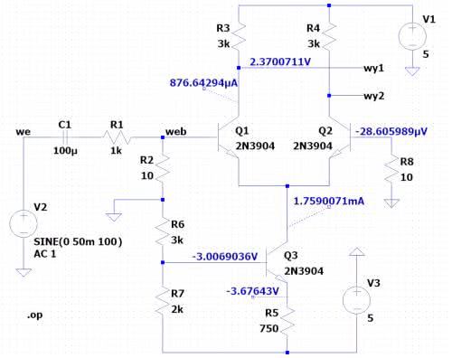 Załóżmy, że wzmacniacz będzie zasilony dwoma napięciami: +5 V i –5 V. Przyjmujemy, że spoczynkowe napięcie na kolektorach powinno być równe mniej więcej 2,5 V. Przyjmujemy również rezystory kolektorowe równe 3 kΩ, z czego wynika, że prądy kolektorów Q1 i Q2 są równe 0,833 mA. Prąd źródła Q3 jest więc równy sumie tych prądów i wynosi 1,67 mA. Jeśli w dzielniku polaryzującym bazę tranzystora zastosujemy rezystory 3 kΩ i 2 kΩ, jak na rysunku 1, to napięcie na bazie Q3 względem masy będzie równe: