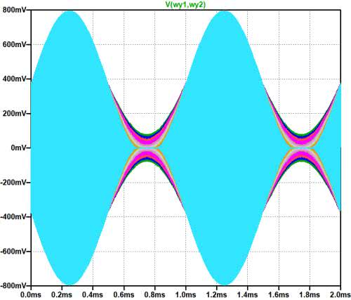 Przed nami najważniejszy eksperyment. Musimy tak zmodyfikować układ, aby można było zmieniać wydajność źródła prądowego Q3. Nie jest to zadanie bardzo trudne, wystarczy za pośrednictwem kondensatora doprowadzić jakiś sygnał zmienny. Będzie on modulował sygnał w.cz. podawany na bazę tranzystora Q1. Modulator jest gotowy. Aby sprawdzić jego działanie wykonujemy symulację .TRAN 2m. Powinniśmy zobaczyć przebieg 200 kHz zmodulowany przebiegiem 1 kHz. Wynik symulacji został pokazany na rysunku 6.