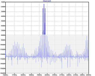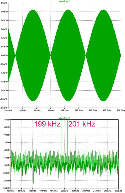 Faktycznie, okazuje się, że widmo zawiera składową częstotliwości nośnej i odbite po obu jej stronach częstotliwości wynikające z różnicy częstotliwości nośnej i modulującej. W naszym przypadku będą więc to częstotliwości: 1 kHz (modulująca), 200 kHz (modulowana) i listki boczne 200 k–1 k=199 kHz oraz 200 k+1 k=201 kHz. Sprawdźmy to w symulacji .TRANSIENT, przy czym dla zapewnienia dużej rozdzielczości analizy FFT wydłużamy czas symulacji do 200 ms. W wyniku tej symulacji uzyskujemy wykres czasowy. Ze względu na długi czas symulacji efekt modulacji nie będzie widoczny aż do momentu, gdy zostanie powiększony jego niewielki wycinek. Wykres widma uzyskujemy po kliknięciu prawym przyciskiem myszki na przebiegu czasowym, a następnie wybraniu poleceń: View → FFT. Następnie w oknie zawierającym wszystkie węzły obwodu wybieramy węzły wyjściowe V(wy1) i V(wy2). Konieczne jest jeszcze wskazanie tych węzłów spośród wybranych do analizy, które mają być wyświetlone. Wybieramy oba węzły, tj. V(wy1) i V(wy2).