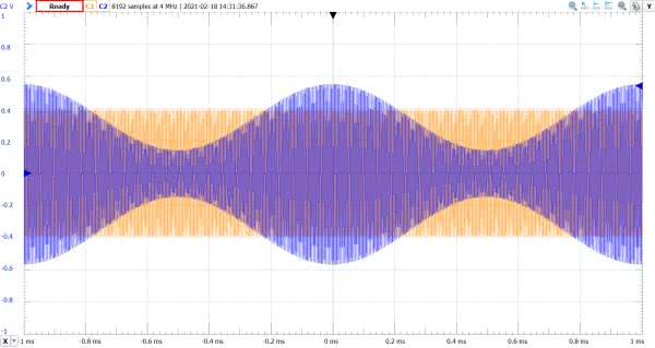 Pierwszy pomiar pasma przenoszenia od wejścia sygnału nośnej do wyjścia różnicowego potwierdza obawy. Górna 3-decybelowa częstotliwość graniczna jest znacznie niższa od uzyskanej w symulacji i wynosi ok. 1,15 MHz (rysunek 11). Nie dyskwalifikuje to jednak układu, gdyż pracujemy w zakresie częstotliwości do ok. 200 kHz. Statyczny pomiar pracy punktu pokrył się niemal idealnie z wynikami symulacji. Pora więc na sprawdzenie czy układ działa zgodnie z zamierzeniami. W takich chwilach emocje zwykle sięgają zenitu. Do wejścia nośnej doprowadzamy sygnał sinusoidalny o częstotliwości 200 kHz i amplitudzie 1 V z 1. kanału generatora arbitralnego Analog Discovery 2. Drugi kanał będzie źródłem sygnału modulującego. Jest to więc sinusoida o częstotliwości 1 kHz i amplitudzie 1 V. Kanał 2. oscyloskopu dołączamy różnicowo do wyjścia modulatora, czyli do kolektorów tranzystorów Q1 i Q2. Możliwość pomiaru różnicowego jest nieocenioną zaletą Analog Discovery 2, co wielokrotnie już podkreślałem. Po chwili w oknie oscyloskopu pojawia się wynik zgodny z oczekiwanym (rysunek 12).