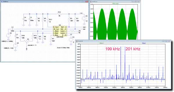 Po ściągnięciu spice’owego modelu tego układu (będzie dołączony w materiałach dodatkowych do artykułu) można przeprowadzić symulację. Korzystamy ze schematu zawartego w nocie aplikacyjnej LM1496. Nie jest to najwygodniejsze do praktycznego zastosowania rozwiązanie, gdyż wymaga zasilania napięciem +12 V i –8 V. Ograniczymy się wiec jedynie do symulacji.