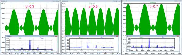 Widoczny na schemacie potencjometr X1 służy do wytłumiania nośnej w widmie sygnału. Składowa ta pojawia się w przypadku, gdy układ nie jest dokładnie zrównoważony. Na rysunku 17 pokazano przypadki dla trzech położeń suwaka potencjometru. Położenia są określone liczbą z przedziału 0...1, przy czym 0 i 1 są położeniami skrajnymi. Jak widać, idealne zrównoważenie układu symulowanego odpowiada pozycji środkowej suwaka, czyli s=0,5. W układach rzeczywistych mogą wystąpić pewne asymetrie, które spowodują konieczność ich korekcji poprzez inne ustawienie suwaka niż w pozycji środkowej. Jak już było wspomniane badanie układu modulatora scalonego LM1496 ograniczamy tylko do symulacji.