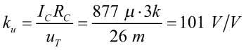 Mając te dane można obliczyć wzmocnienie mierzone jako stosunek różnicowego napięcia wyjściowego do napięcia wejściowego występującego na bazie tranzystora Q1: